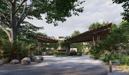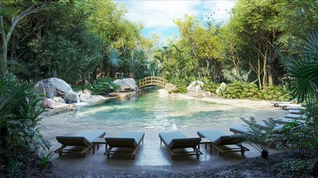 Una alberca tipo río de 103 m de longitud que se integra de manera natural, pool natural en el paisaje brindando una experiencia auténtica y relajante, ohm reserve rodeado de naturaleza, walking trails, contemplation spaces, jungle gym un espacio diseñado para hacer ejercicio entre la naturaleza